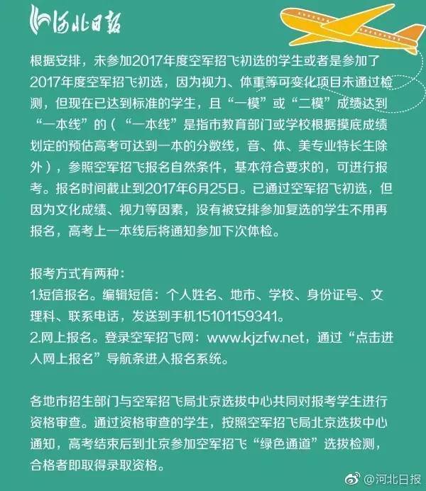 为了让更多青年学生实现励志蓝天、投身军营的梦想,经空军招飞局批准,决定在河北省开展空军招飞补充报考工作,为错过首次报考的学生开辟“绿色通道”。报名时间截止到2017年6月25日。