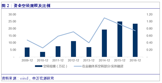 一般的狭义理解是,资金在金融体系多个机构间流转,没有流入或者至少是没有直接流入实体经济。广义点的理解还包括大量资金流入房地产市场。本文着眼于资金在金融体系中的空转,即第一种狭义的理解。