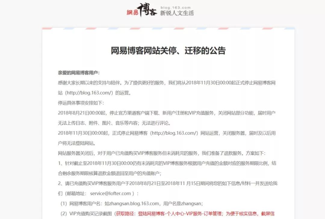 8月20日晚,成立12年的网易博客在官网首页发布公告称:网易博客将于2018年11月30日00:00起,正式停止网易博客(http://blog.163.com/)网站运营,关闭服务器。网易博客的内容将会被迁移至网易LOFTER平台,网易博客提供「一键搬迁博客文章到LOFTER」功能,不过,用户需要提前验证博客的手机号。