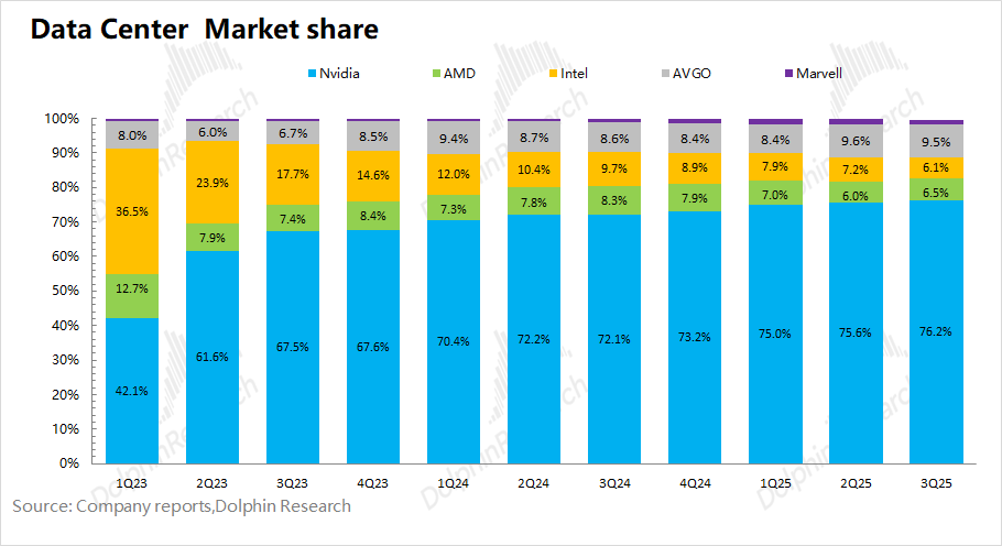 在英伟达的高额垄断溢价之下,谷歌、亚马逊等大型CSP都开启了自研芯片。尤其是在谷歌TPU的持续拉货下,博通AVGO已经成长为AI芯片市场中的“老二”(目前市占率在10%左右)。