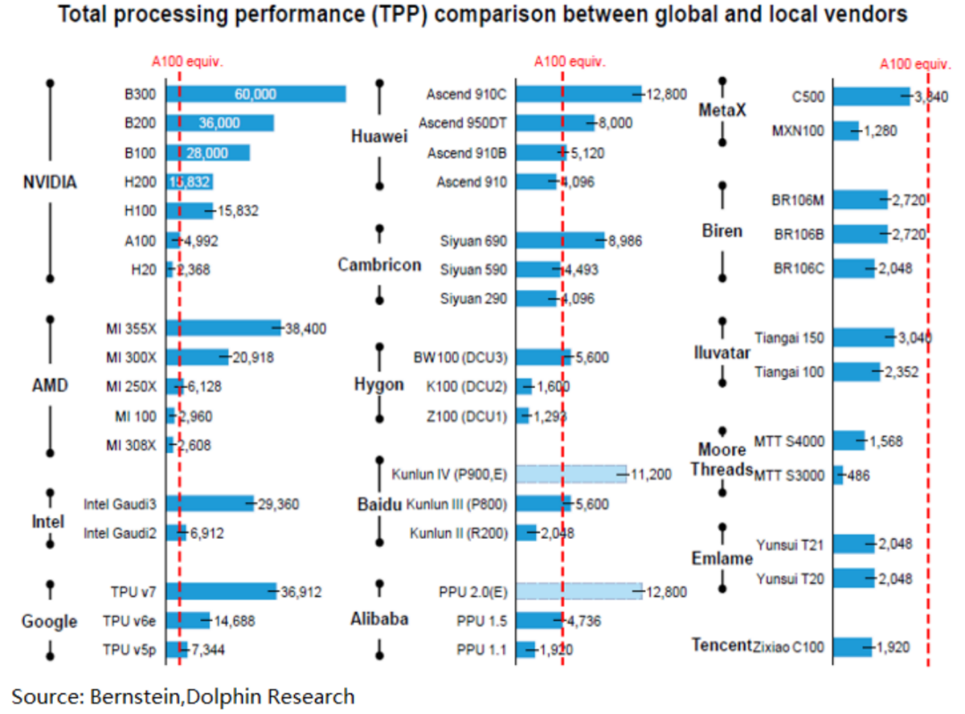 即使是一年后的950芯片,在总处理性能(TPP)角度,要赶上H200的话还是不够,需要等到2027年四季度的华为Ascend 960系列产品。