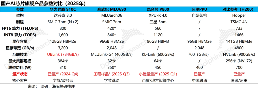 在路线图演进上能看到和H200竞争的,要等到华为下一代950芯片(适用于FP8),它会是首款能用到训练上,同时内存配置、卡间互联和集群能力都比较强的国产芯片。