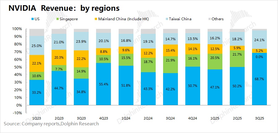 1. 中国市场基本已经丢失:原本英伟达可以在中国市场销售H20芯片,而在H20被禁之后,中国市场在英伟达最近报表中的份额已经滑落至5%左右(原本中国市场能给贡献公司2成左右的收入)。