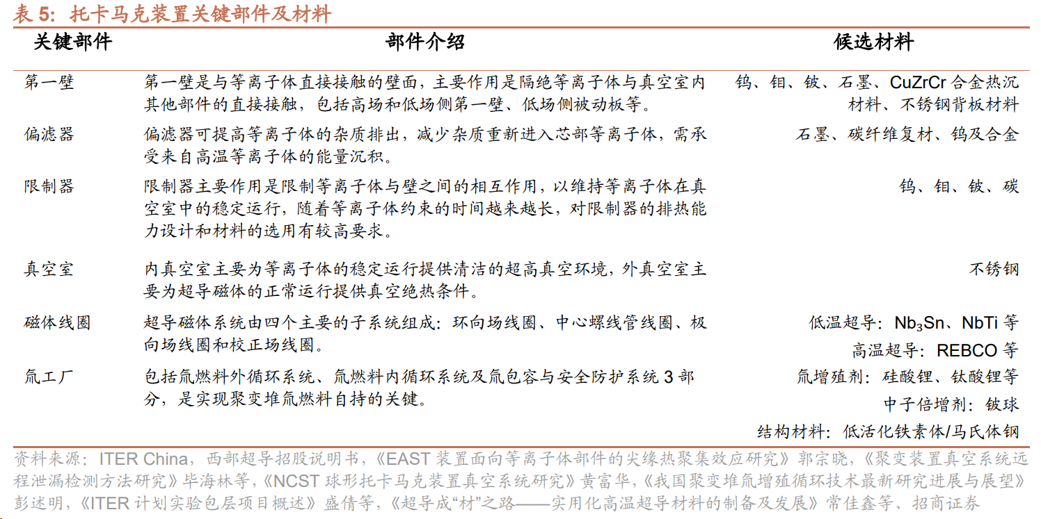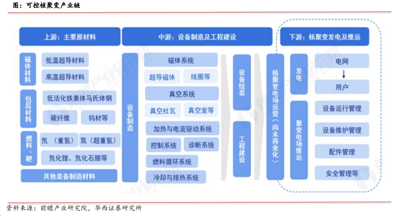 中游主要为各类设备以及反应堆工程建设,以最常见的托卡马克核聚变实验装置为例,相关设备包括磁体系统、真空系统(包括偏滤器、第一壁)、加热与电流驱动系统等核聚变主机设备以及压力容器、蒸汽发生器、汽轮机、各类泵阀等其他设备。