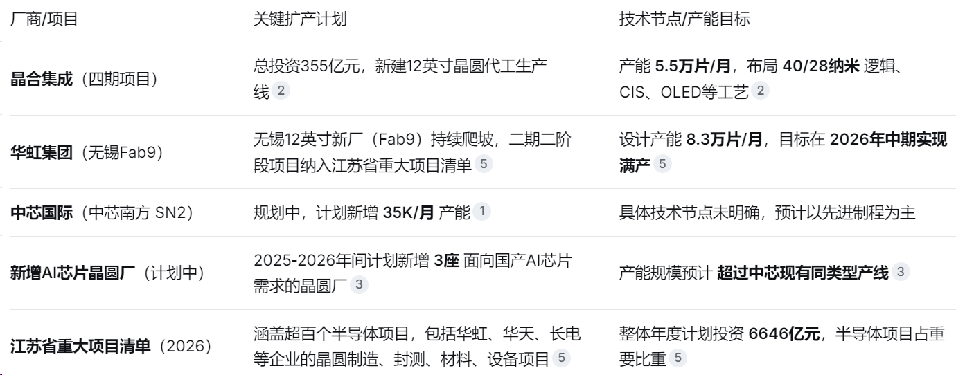 2026.国内晶圆厂均有扩产计划,扩产目标主要集中在满足AI芯片需求、提升成熟制程产能及国产化替代上。