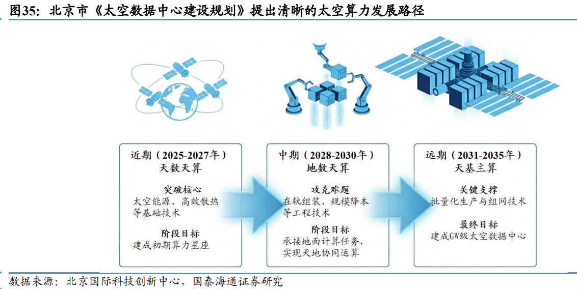 中国太空算力发展已在核心技术领域实现突破,当前正转向在国家顶层设计框架下,开展涵盖政策、产业、技术、资本的全链条体系化部署。2025 年 11 月, 北京市正式发布《太空数据中心建设规划》,提出了业界首个清晰的“三步走”路线图。
