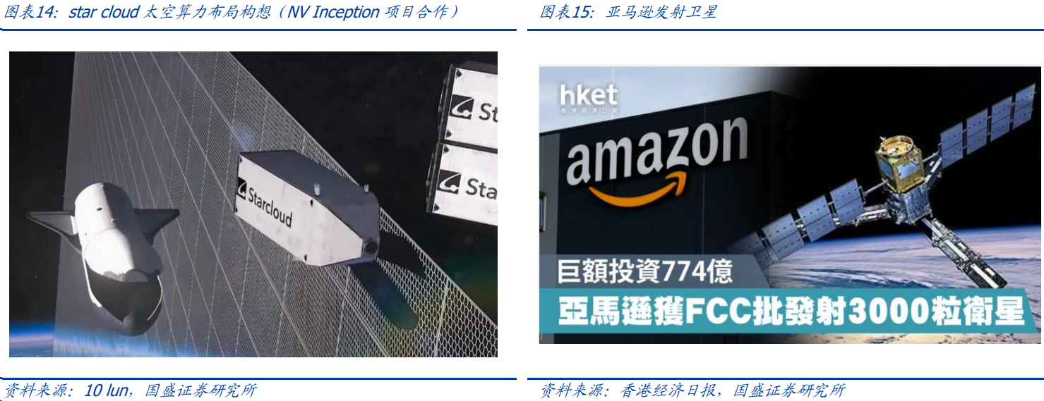 Amazon 执行主席贝佐斯预测未来10至20年内将在太空建立GW级数据中心。初创公司 Starcloud与英伟达合作,已于11月首发搭载 H100 GPU 的卫星。 目标为建立5GW的太空数据中心,有望能在2030年建成40兆瓦数据中心。