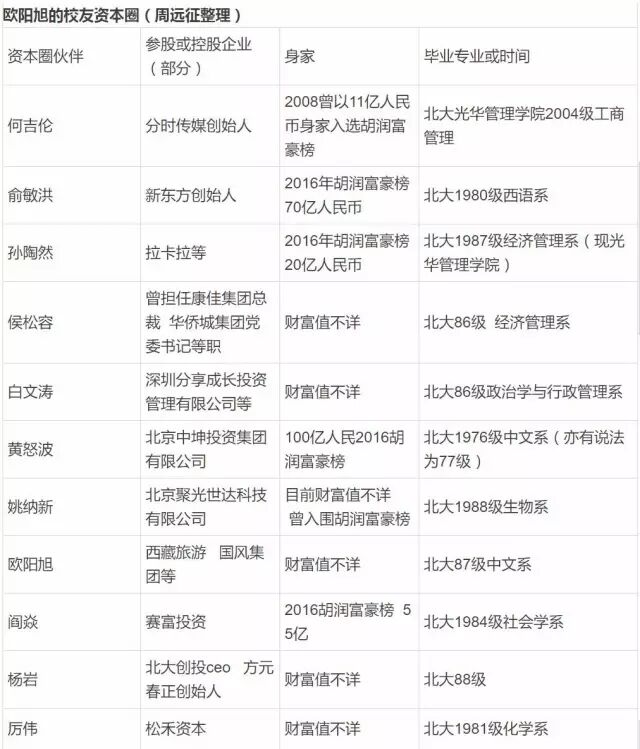 关键的时刻,欧阳旭的北大校友们也来到了拉萨。2015年8月,一场庆祝慈善拍卖成功的晚宴中,欧阳旭的一众北大校友出席。彼时,记者正在西藏采访,亦接到友人邀请参加此次晚宴(欧阳旭校友资本圈见表)。