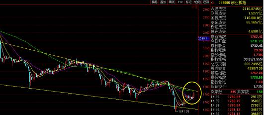 这个是创业板的下降趋势图,目前指数仅仅是在通道中运行,虽然今日创业板指大涨,但要说突破上轨启动新一轮行情还为时尚早。经历过牛熊的人都知道,市场的底部永远不是一个点,而是一个区间,目前创业板下跌趋势依然没有扭转,如果有人跟我说创业板大涨了,我是不会相信的。