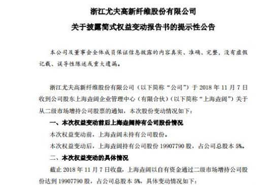 *ST尤夫公告:截至2018年11月7日收盘,上海垚阔企业管理中心(有限合伙)以自有资金通过二级市场增持公司股份达到19907790股,占公司总股本5%,构成举牌。