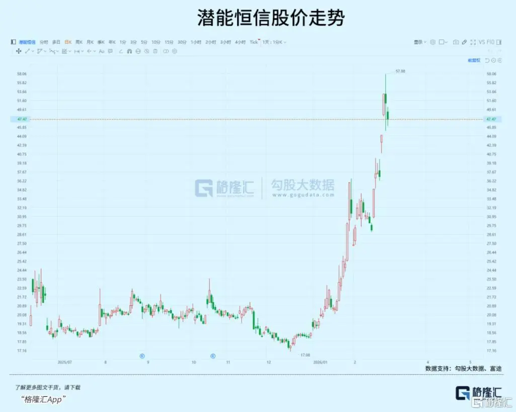 潜能恒信股价从17元低位附近启动,到3月3日强势涨停站上53元,短期涨幅高达约200%。