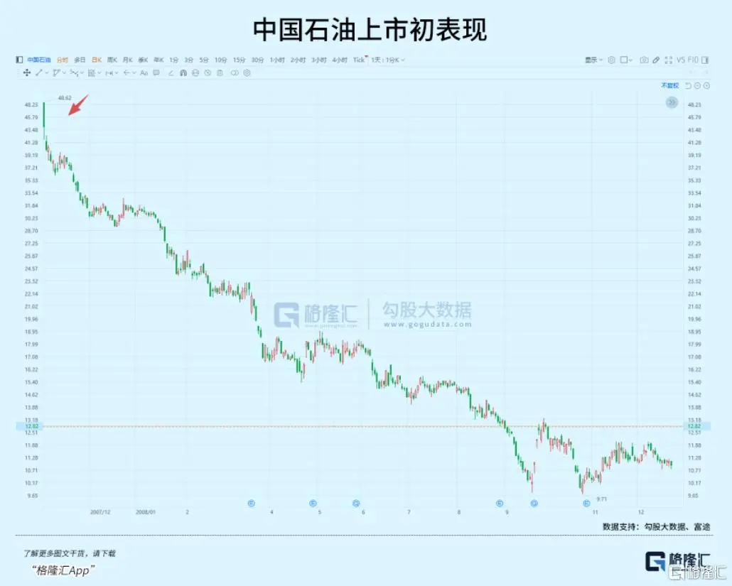 随后次贷危机爆发,国际油价见顶后开始直线下滑,中国石油股价跌破10块钱,而且此后7年一直在个位数徘徊。