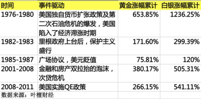 对不起啊,白银大哥,我们低估你了。从上面这张表可以看出,近四十年无论是贵金属的大牛市还是小牛市,白银的涨幅都远高于黄金。尤其是通胀推动的贵金属大牛市(70年代滞涨时期和2000年后),白银的表现更加亮眼,涨幅基本是黄金的两倍。因为大牛市的孕育时间较长,给价格上涨提供了更足够的时间和空间。同时,因为白银的商品属性要强于黄金,因此在通胀情势加剧的情况下,导致白银价格上涨幅度比其他牛市时期大。