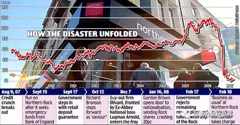 资产端恶化(造假和违规的操作、房贷的低质被暴露出来),面临着资产端流动性大幅度下降、坏账率上升、还贷人受到收入的影响断贷的比例开始上升; 而另一端,很多储户对北岩银行失去了信心,产生了不信任,股价开始逐步下跌,金融机构的失血开始形成典型的负正反馈的机制:股价越跌、市值越小、杠杆越高。