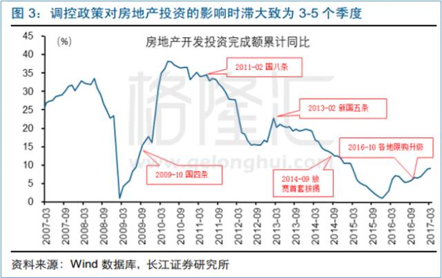 另外从房地产开发投资数据看,今年首季仍保持惯性的增长。根据长江证券研究,从历史经验来看,地产调控政策对房地产投资的影响时滞大致在3-5个季度,也就是说去年10月初集中出台的地产调控政策在今年年中到今年年底将对房地产投资产生实质性的负面影响,房地产投资将逐步下降,而加上今年3月新一轮的调控,后续影响将持续到明年。