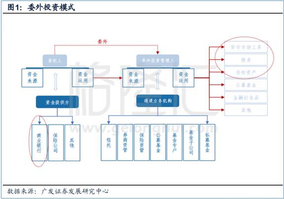 委外即委托投资,指委托方将资金委托给外部机构(管理方)主动管理的投资业务,主要是银行将自有资金和理财资金委托给券商、保险、信托等进行投资。在2016年“资产荒”的背景下,受托机构只能通过加杠杆、期限错配等方式实现第二次套利,委外成为诱发杠杆高企的重要资金来源。