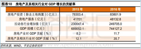众所周知房地产在国内的经济中扮演非常重要角色。房地产除了自身能贡献第三产业增加值,对第二产业的建筑、水泥、家电等也有明显的拉动作用。根据平安证券按GDP的生产法的测算,2016年中国GDP规模744,127亿元,房地产行业本身对GDP增长的贡献率为11.7%,而房地产及相关行业对GDP增长的贡献率为35.7%。2016年房地产市场的火爆使得房地产对GDP贡献的占比也明显提升。