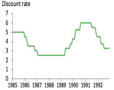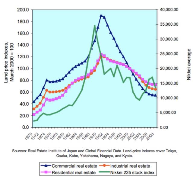 以日本世纪性的房地产泡沫为例。在维持了两年零三个月的超低利率后,日本央行终于在1989年5月启动加息。1989年12月29日,日本股市达到顶点后开始崩溃。房地产泡沫则反应稍慢,在1991年达到历史顶点后崩溃。