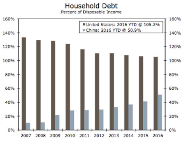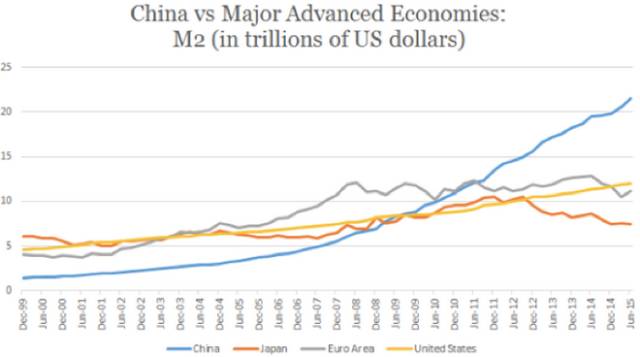 2009年到2015年之间,中国信贷平均每年增长20%左右,大大高于名义GDP增长率。截止2016年末,中国M2达到155万亿(约22万亿美元)、GDP为74万亿(11.7万亿美元),而美国的M2和GDP分别为13万亿美元和18万亿美元。换言之,中国的GDP只有美国的2/3,但中国的货币量却相当于美国的1.7倍!这是理解房价泡沫的关键数据。