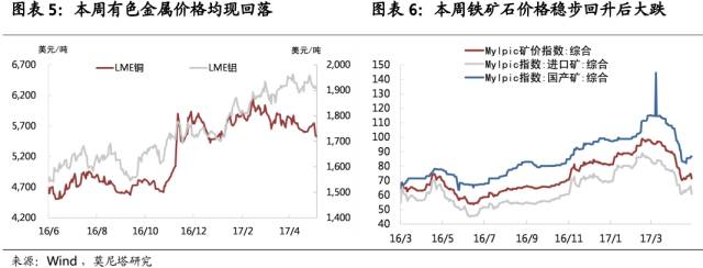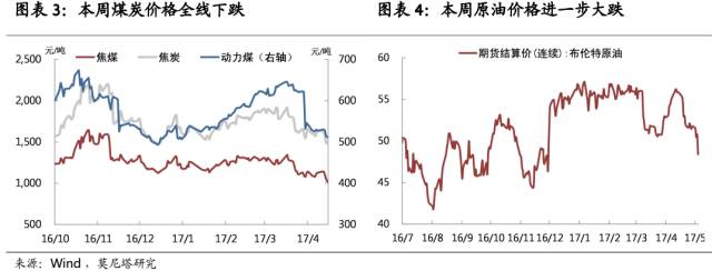 原材料价格普遍下跌。本周煤炭期货价格全线走弱,其中,焦煤、焦炭和动力煤价格分别环比下跌1.9%、3.6%和1.2%(图表3)。进入5月,随着大秦线检修结束,煤炭供应逐步增加,但需求较为低迷情况下,煤炭交易呈现出有价无市的局面,供需矛盾出现转换。目前神华、中煤两大煤企率先下调了月度长协价,后续其它大型煤企有望跟进。布伦特原油期货结算价周四收于48.4美元/桶,周环比进一步大跌2.9%(图表4),抹去去年OPEC达成减产协议以来的全部涨幅。美国石油钻井机活跃数已连涨16周,再次刷新2015年4月以来新高,与之相伴,美国石油产量已回涨至与2015年7月的峰值仅差3%;而媒体报道OPEC考虑延长减产协议但不会扩大减产规模。但技术面的原因对本周的暴跌起到了更为关键的作用:本周布伦特原油价格下破了下行通道上边沿,随后曾尝试向上突破未果,导致转而下行急跌。预计油价后续反弹机会较大。