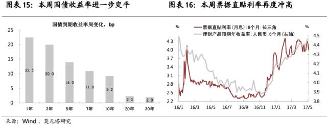 收益率曲线持续“熊平”。本周国债收益率曲线继续变平,各期限上行幅度逐一递减,1年期收益率上行最多达22bp,10年期上行9.2bp,30年期仅上行2bp(图表15)。短端利率快速上行,仍然受到资金面持续紧张的冲击。此外,周四传闻证监会叫停券商资管资金池业务,进一步加剧了金融监管的悲观预期,由此导致的债券抛压,也助推了收益率的进一步上行。近期长端利率之所以上行乏力,或有两个原因:一是,近期债市调整主要受到金融监管和货币偏紧的冲击,而经济基本面开始逐步回落几乎已成市场共识,长端利率作为与经济基本面预期关联更紧密的品种,收益率上行空间受限;二是,近期美债长端利率上行乏力,对国内长债收益率亦形成压制。然而,尽管长债利率水平已经具备一定的配置价值,但金融监管压力下,市场配置情绪依然较差。这体现在7-10年期国债收益率依然倒挂,以及周三国债招标出现一级中标利率高于二级市场利率的情况。长债收益率的显著下行仍需等待经济数据的进一步走弱,以及金融监管节奏阶段性放缓的配合。