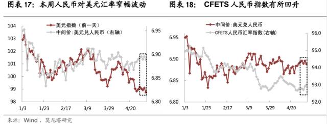 人民币对美元汇率继续窄幅震荡,CFETS人民币指数有所升值。本周,人民币兑美元中间价较上周略微升值47点,收报6.8884;即期汇率略微贬值27点,收于6.8968;截至周四,CNH小幅升值52点,收于6.8924;CFETS人民币指数后半周有所回升,收于93.0(图表17、图表18)。中国4月外汇储备环比增加204.3亿美元,连续第三个月上升,并站稳3万亿。这其中,非美货币对美元升值所引起的估值上升因素贡献较大,但也反映出在美元震荡走弱、中国资本管制强化的背景下,我国跨境资本外流压力明显减轻。考虑到二季度美元指数上行动能较弱,资本外流压力有限,人民币汇率仍将继续处于“蜜月期”。而外部失衡的压力缓和,无疑将为内部失衡的调整创造更为充分的空间。因此,二季度同时也是加强金融监管的“窗口期”,其对市场行为的冲击或将成为资本市场的主要矛盾。