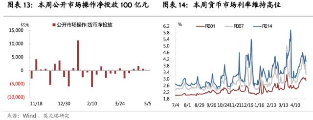 资金面持续紧张。本周公开市场共有2400亿元逆回购到期,央行开展逆回购操作2500亿元,其中,7天期2000亿元、14天期300亿元、28天期200亿元,投放资金期限较短。公开市场仅实现资金净投放100亿元(图表13)。此外,周三到期的2300亿元MLF并未续作,整体资金投放量的减少,对市场情绪产生了明显冲击。本周货币市场利率依然维持高位(图表14),直到周五资金面才呈现出一定的松弛迹象(或与财政存款到账有关)。