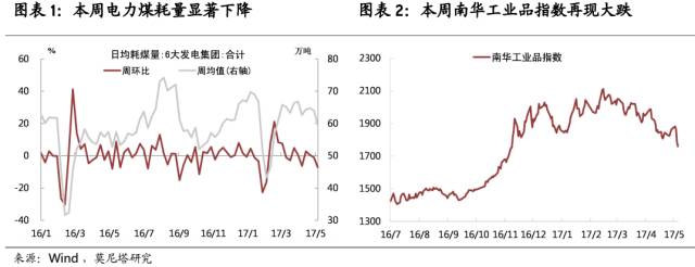 工业生产景气下滑,工业品价格大跌。本周六大发电集团日均耗煤量较上周显著下滑7.1%,创去年11月中旬以来最低水平,工业生产出现了规模收缩的迹象(图表1)。4月发电煤耗同比增速较上月小幅下降,结合4月PMI产成品库存指数上升来看,工业生产的持续平稳可能加速库存的被动积压,加剧后续工业生产放缓的压力。对发电煤耗的变动趋势尚需进一步跟踪,我们预计后续工业生产规模收缩或将持续呈现。本周南华工业品指数收于1760点,较周二大跌6.5%(图表2)。工业品价格经过前半月小幅企稳回升后,本周再现大跌,可能进一步施压工业生产。