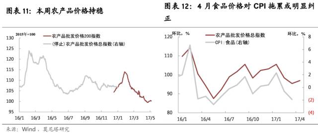 食品价格企稳。本周农产品和菜篮子批发价格指数保持平稳,周均值分别较上周小幅上涨0.4%和0.5%(图表11)。4月农产品批发价格指数环比略有回升,而去年同期该指数进一步显著回落(图表12)。在此情况下,4月食品价格对CPI同比的拖累将得到明显纠正。不过,考虑到去年4月猪肉价格大幅攀升,而今年4月猪价震荡下跌,猪肉价格仍将显著拖累CPI同比。综合以上两方面的影响,4月CPI食品价格环比或回升至0.1%左右。