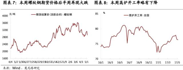 钢价后半周大跌,市场化债转股全面提速。螺纹钢期货结算价本周后半周再现大跌(图表7)。高炉开工率继上周显著下降后,本周基本持平于76.4%(图表8)。螺纹钢价格大跌一方面源于多头的获利减仓;另一方面,当前钢材生产利润丰厚(一季度36家钢铁行业上市公司净利润总额创下2009年以来一季度的最好成绩,并接近于巅峰时期的2008年),刺激钢企维持满负荷生产。供应宽松格局下,市场对于钢价反弹信心不足也是造成后半周大跌的原因之一。有传言称,5月“一带一路”峰会环保限产时间长达20天,届时供给收缩或将对钢价提供一定支撑。此外,值得关注的是,五一前夕,在银监会指导下,中国钢铁工业协会召开典型钢铁企业“去杠杆”交流座谈会,讨论下一步“去杠杆”和市场化债转股工作。截至4月19日,市场化债转股签约金额为7672亿元,实际实施金额为592亿元。市场化债转股已全面提速,目前监管部门正进一步细化市场化、法治化债转股相关措施。据粗略估计,本轮市场化债转股市场总规模将以万亿元计。