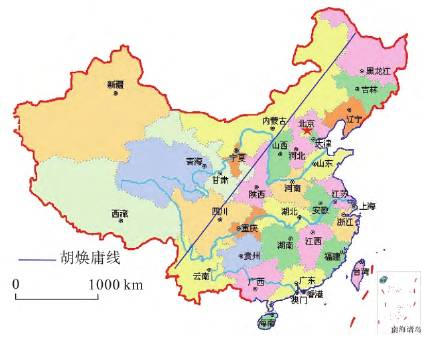 (1935年胡焕庸先生用手工画图发现的“爱辉-腾冲线”,亦称胡焕庸线)