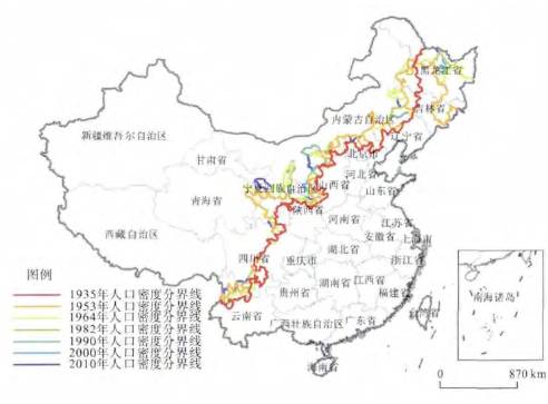 (1935-2010年的人口密度分界线,基本围绕胡焕庸线波动)