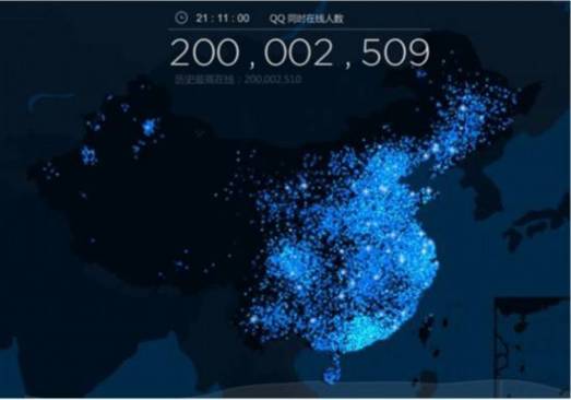 (2014年4月,腾讯QQ同时在线用户突破2亿,这张分布图再次验证了胡焕庸线。)