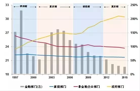 杠杆率的波峰波谷往往同一个国家的兴盛衰退紧密相连。总体看,高而稳定的杠杆率水平并不一定意味着高风险,而需要引起注意的是快速增长的杠杆率。杠杆率判定上有一种“5-30规则”,认为在5年的时间内,若以一国信贷规模与GDP之比为代表的杠杆率水平增长幅度超过30个百分点,之后该国就会迎来一轮金融危机,这一规则已被多次验证,如1985-1989年的日本经济、1993-1997年的泰国和马来西亚经济、2003-2007年的美国经济等。 那么高杠杆是如何引发金融危机呢? 杠杆率过高往往会导致负债方的付息偿债压力过大而无法维持,从而出现违约、破产清算或重组的情况。当较多企业出现债务问题,大面积的违约和清算将触发费雪的债务-通缩多米诺骨牌,引发大规模廉价抛售、资产价格下跌、通货紧缩、失业率上升、实际利率上升等一系列连锁反应,从而引发金融危机。 二、美国走出次贷泥潭得益于成功去杠杆 2008年次贷危机导致美国经济硬着陆,但经过一系列政策手段,美国通过政府加杠杆,来帮助居民和企业缓慢去杠杆,从目前美国经济指标来看,美国的去杠杆进程是成功的,失业率低,通胀稳定,经济增长较快,2015年、2016年实际GDP增长分别达到2.6%、1.6%。 (一)危机前美国杠杆率高企的原因 金融危机之前,美国经济杠杆率不断上升。 从监管缺失角度看,金融监管的欠缺导致美国金融创新过度、评级与风险偏好失真,过于宽松的按揭贷款政策使得美国家庭负债率水涨船高。 从资产泡沫角度看,危机前房地产价格的快速攀升导致了市场形成资产价格上涨的单向预期,持续推动了以获取资产增值收益为目的的信贷投资需求扩张。 在上述因素的影响下,金融危机前美国各部门杠杆率上升迅速。 一是家庭部门的杠杆率不断上升。2001-2007年,美国家庭部门杠杆率提高了24.2个百分点,这一期间美国家庭消费倾向明显上升,美国家庭债务与可支配收入的比率从约90%升至120%以上。在房地产资产和按揭贷款带动下,家庭部门总资产亦出现较明显的增长,房价与租金比例显著高于平均水平,资产泡沫快速形成。 二是金融部门高杠杆运行。金融机构杠杆率从2001年的13.3倍提高到了2008年的23.6倍。美国家庭和政府部门的过度借贷和高杠杆都是通过金融部门来实现。金融市场的高杠杆集中体现在以投资银行为代表的金融机构的运营上。以高盛为例,其2007年末财报披露的财务杠杆为26.2倍;雷曼在破产前杠杆倍数达到37倍。 三是非金融企业杠杆率上升明显。2003-2007年非金融企业杠杆率提高了10.8个百分点,2007年非金融企业杠杆率达到72.7%。 四是政府债务不断累积。2001-2007年,美国政府部门杠杆率提高了9.6个百分点。由于布什政府推行减税和增加开支的政策,美国的财政预算自2002年开始一直为赤字状态。2007年美国政府财政赤字占GDP 比重达到4.9%,联邦政府负债占GDP 比重达到55.6%,州和地方政府负债占GDP 比重达到24.7%。 图表1:美国各部门杠杆率走势 数据来源:BIS,美联储,中泰证券研究所 图表2:危机时美国企业杠杆率与资产负债率齐升 数据来源:BIS,美联储,中泰证券研究所 (二)美国去杠杆的政策举措 在次贷危机时期,为了避免金融市场流动性困难,降低家庭部门和金融机构的债务压力,美国政府采取了一系列创新财政货币手段和逆周期的政策举措。 一是美联储通过资产购买计划,持续向市场提供流动性,以应对次贷危机引发的大规模信贷紧缩,修复货币传导机制,扩张信用,帮助金融机构和家庭部门平稳降低杠杆率。 第一,启用短期招标工具(TAF)、一级交易商信贷工具(PDCF)、定期证券信贷工具(TSLF),分别向存款金融机构和一级交易商提供流动性。 第二,启用资产支持商业票据货币市场共同基金流动性工具(AMLF)、商业票据融资工具(CPFF)、货币市场投资者融资工具(MMIFF),分别向存款类金融机构和银行控股公司、票据发行人以及货币市场投资者提供流动性。 第三,启用中长期证券购买计划、定期资产支持证券信贷工具(TALF),向房利美、房地美、联邦房贷银行、持有资产支持证券(ABS)的美国企业和投资基金提供流动性。 二是政府部门通过加杠杆,大幅提高预算赤字,实施大规模的经济刺激计划以提振总需求。通过《美国复苏与再投资法案》,从2009年开始的10年间投入7872亿美元,用于减税、政府财政纾困,以及健康医疗、教育科研、交通运输和房屋城市发展等领域的投资。2009年美国政府预算赤字达到创纪录的1.42万亿美元,占GDP比重升至10.1%的最高水平。同时,美国政府积极采取增长导向的减税政策,例如允许企业冲销固定年度的资本性投资;对中小企业实行税收减免、投资优惠、雇佣奖赏等。这些政策鼓励了企业在美投资,既有助于创造就业,也能扩充资本存量,支持经济增长。 三是美国政府和联邦存款保险公司(FDIC)积极帮助企业解困。2009年美国会授权美国政府,使之有权决定托管或接管陷入困境的金融机构,然后对它进行有效和有序的重组,即通过出售或转移出现问题的金融机构的资产或债务,或者就金融机构的合同进行重新谈判,以及处理金融衍生产品投资等途径,防止了金融机构资产负债状况进一步恶化。FDIC也将处置对象从濒临破产的金融机构扩大到受危机影响严重、经营压力较大的金融机构。FDIC通过积极对收购问题贷款的投资基金进行担保,以及出台临时流动性担保计划,致力于解冻信贷市场、