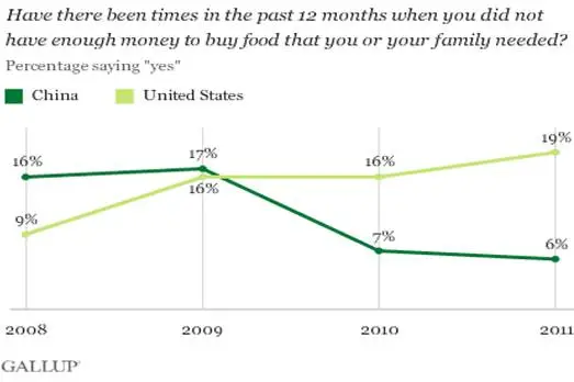 图上那2张纸是美国的占领华尔街运动的参与者们写的为什么参与这个运动,下面是盖洛普的民意调查结果表明美国贫困率大幅度上升,中国的贫困率显著下降。