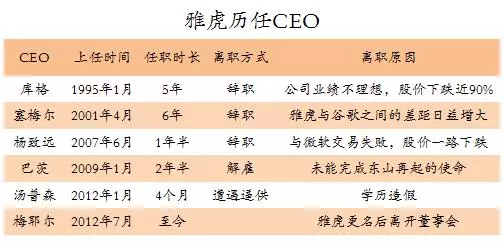 更加奇葩的是,雅虎22年换了7任CEO,最长的任期6年,短的仅4个月就被董事会赶下台。