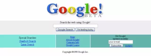 Google1998年的页面,标识后面也有个惊叹号,可能在模仿Yahoo!