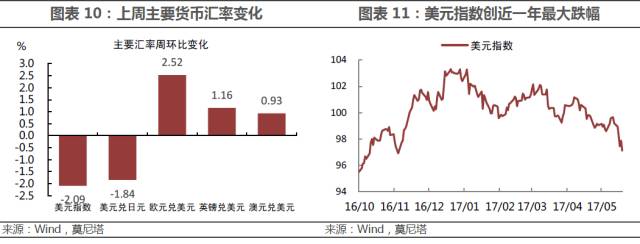 上周美债收益率下行,1年期、2年期和10年期国债收益率分别下行1bp、1bp和10bp,10年期国债收益率回落至2.23%(图表 20)。德债收益率大幅下行,1年期、2年期和10年期德国国债收益率分别下行2bp、5bp和11bp(图表 21)。欧债和美债收益率下行也与特朗普事件有关。不过,目前欧洲政治和经济形势良好,与美国当前情况形成鲜明对比。欧洲央行行长德拉吉上周表示,欧元区经济复苏动能在不断增强,这增加了市场对欧央行提早收紧货币政策的信心,欧债收益率在上周五出现小幅回升。目前,美国和德国10年期国债利差收窄至187bp,远低于4月的216bp。如果年内意大利债务或银行问题没有爆发,那么欧洲经济有望继续保持当前的良好势头,美欧长期国债利差可能进一步收窄。