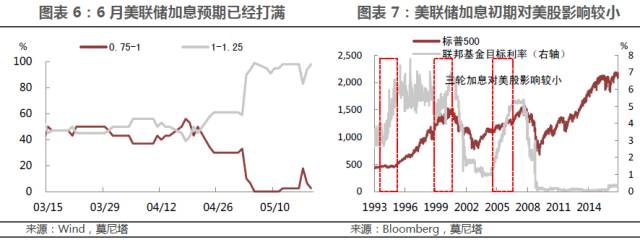 美联储正走在货币政策正常化的道路上,今年以来一直偏鹰派的态度,也令市场平添担忧。5月初美联储最新货币政策会议结束后,市场对6月再加息一次的预期迅速打满,“泄密门”引起短暂波动后也很快平复(图表6)。不过,即便美联储加快加息态度已经非常明确,美股却未受到很大影响,继续运行在原先轨道上。究其原因,正如我们在《夕阳还是朝阳》中所提到的,美联储加息周期的启动阶段对美股不会造成太大影响,真正影响美股走势都是在其连续多次加息之后(图表7)。也就是说,若美联储保持谨慎行动的方式,即便今年再加息2-3次,对美股也不会造成很大的冲击。