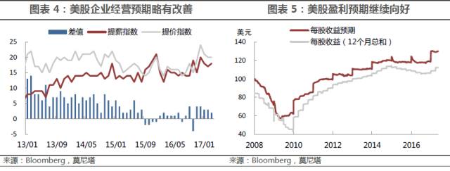 如果我们回归美股公司的基本面来看,那么泡沫又似乎没有那么明显。美股上市公司的基本面情况不仅没有恶化,而且在不断改善。美股企业经营预期虽然没有2012-2013年那么好,但一直在回升,目前经营预期已经远好于2015年和2016年(图表4)。美股收益预期和每股收益也表现良好,二者今年以来都有显著上涨(图表5)。