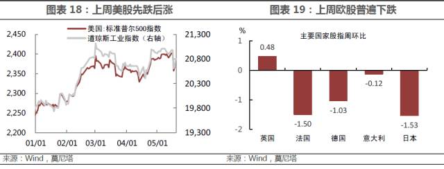 上周美股全线收跌,道琼斯工业平均指数、标准普尔500指数和纳斯达克综合指数环比分别下跌0.4%、0.4%和0.6%,至20803.58、2381.73和6083.7(图表 17)。欧股和日股也普遍下跌,法国CAC40指数、德国DAX指数和意大利ITLMS指数环比分别下跌1.5%、1.0%和0.1%,日经225指数下跌1.5%(图表 18)。全球主要股指普遍下跌均因特朗普的“泄密门”事件,由于市场担心特朗普被弹劾,无法兑现原先承诺的减税、加大基建以及放宽监管等措施,股市遭到抛售。不过上周五,主要股指均小幅收复失地,“泄密门”事件的影响或暂缓和。