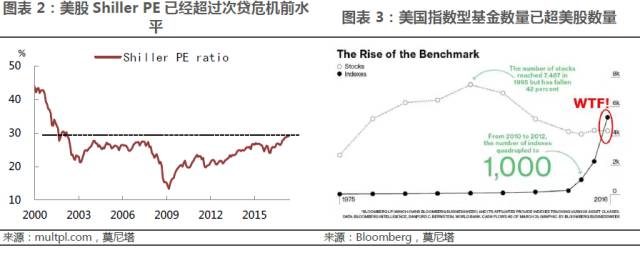 对美股最典型的看空者就是“新债王”冈拉克(Jeffrey Gundlach)。他就在近期频繁建议投资者买入新兴市场股票,并沽空标普500指数ETF。他对美股的悲观情绪并非来自“泄密门”,而是认为美股本身估值过高,泡沫过大。这样的泡沫是被被动投资推升的,即将被美联储加息所戳破。那么,美股是否真的存在泡沫呢?