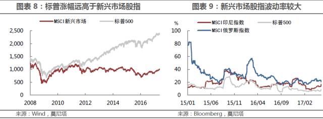 相对于美股,新兴市场股市整体估值较低。2012年以后,MSCI新兴市场指数估值与标普500的估值开始拉大,PE相差约5个单位(目前新兴市场PE约为15倍,标普500约为21倍)。美股与新兴市场股指的价格也从此逐渐拉大(图表8)。就此而言,新兴市场股市的相对优势就是估值偏低。然而,新兴市场股市存在波动率较大的问题。以30天平均波动率来看,新兴市场国家股指波动程度普遍是标普500指数的2-3倍。而且,政治不稳定是新兴市场的重大隐患,类似于巴西总统受贿事件和卢布突然贬值这种事件的频繁发生,都曾对新兴市场股市造成巨大冲击。退一步说,即便美联储过快加息造成美股下跌,新兴市场也逃不了干系,且调整幅度很可能超过美股。