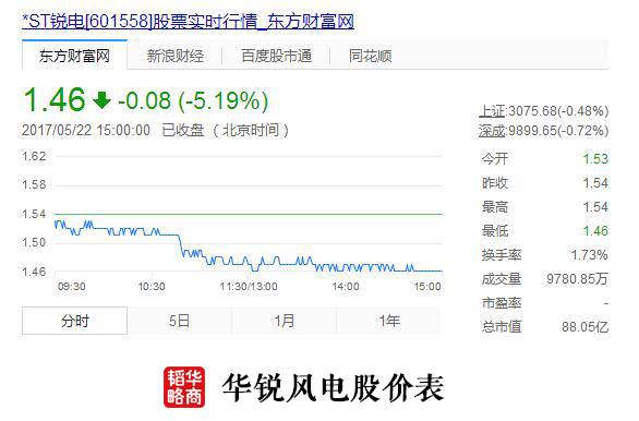一番折腾之后的华锐风电更加羸弱,并在2014年5月被戴“ST”的帽子。此后,虽然公司为防止被暂停交易或退市采取了一系列的措施,但依然是大势已去,木已成舟,直到今日,上市地位是被保住了,但股价却跌成这个样子。