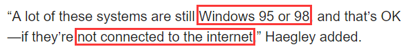 幸运的是,这些运行古老系统的电脑都没有连接互联网,所以它们难以被入侵。