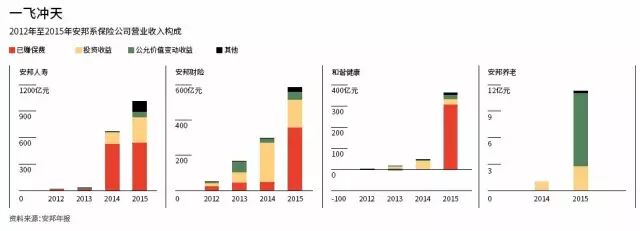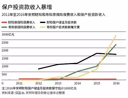 安邦旗下的寿险类公司(安邦人寿、和谐健康及安邦养老)之所以能从2014年起在保费收入上实现惊人的飞跃,是得益于安邦利用银行通道激进销售理财型万能险产品,快速获得配置风险资产的杠杆资金,以负债撬动资产端,做大投资和总资产后再在承保端吸引客户资金流入。