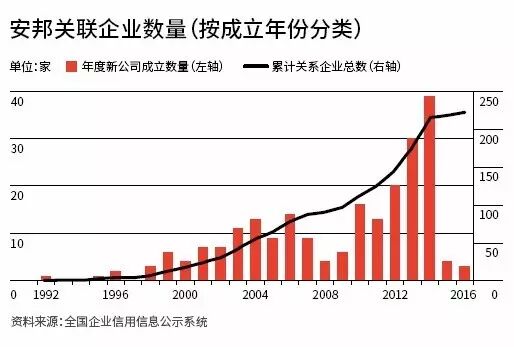 如果分析这200多家安邦关联企业圈企业的成立年份,可以发现,在安邦重要增资日期前几个月,新成立的公司数量激增。这项线索的重要含义下文会继续分析。