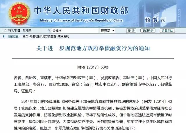 原标题为《关于进一步规范地方政府举债融资行为的通知》
