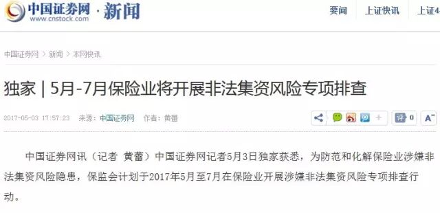 中国证券网记者5月3日独家获悉,为防范和化解保险业涉嫌非法集资风险隐患,保监会计划于2017年5月至7月在保险业开展涉嫌非法集资风险专项排查行动。