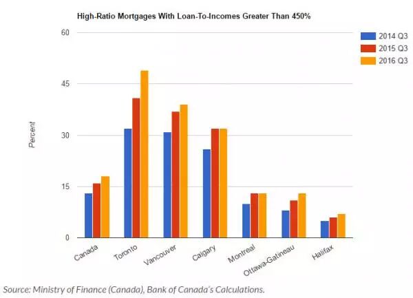 最为可怕的是,取得住房抵押贷款的人群中有不少低收入者。在加拿大,发放给低收入人群的高风险抵押贷款占到总量的18%,两年来增长了38%。多伦多同期增长53%,达到49%。其次是温哥华,过去两年增长了25%,达到39%。这两个城市的移动速度远远高于全国平均水平,目前这些城市正处于高风险水平。